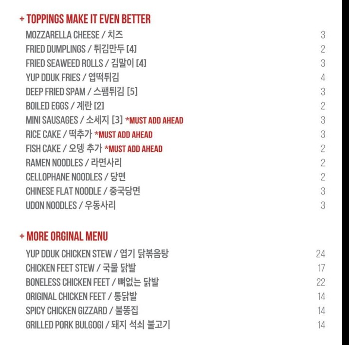 . Just order the tteokbokki here. The chicken stew and chicken feet are really not good. I ordered the chicken stew because it reminded me of what I used to eat in Korea, but as expected, it didn’t taste anything like it. Maybe it’s because the ingredients are different—the flavor was off, and even though I ordered it mild, it wasn’t spicy at all. I froze half of the chicken stew, but I ended up just throwing it away. The chicken feet were so tough that they were inedible, so I threw them all out too. It completely ruined my Friday evening. I wanted to ask for a refund, but I figured they wouldn’t give me one just because it didn’t taste good, so I held back. 떡볶이는 한국엽떡까진 아니어도 비슷한편, 하지만 닭볶음탕, 닭발은...진짜 솔직히 왜파는지 모르겠음 닭발 특히 비리고 양념맛없고 질기고 거뭇거뭇함